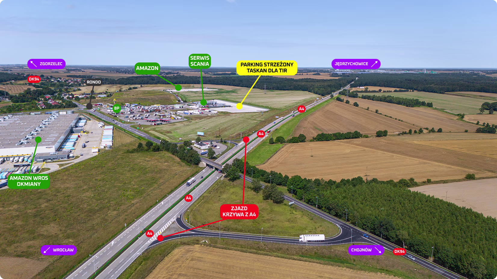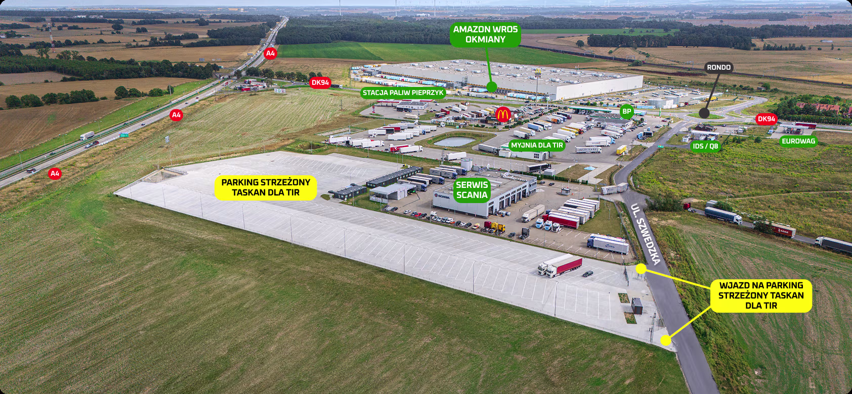 Parking Taskan znajduje się w miejscowości Okmiany, tuż przy węźle Krzywa na trasie A4. To kluczowy punkt na mapie transportowej Polski, umożliwiający szybki dostęp do głównych szlaków międzynarodowych prowadzących do Niemiec, Czech i innych krajów Europy Zachodniej.